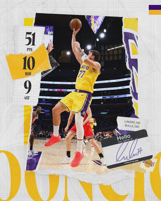 東契奇出戰37分鐘,投籃31中17,三分14中9,罰球9中8,狂轟51分10板9助3斷1帽1失誤,正負值+16。這是東契奇NBA生涯第8次50+,也是他在湖人的首次50+!東契奇罰球時,湖人球迷高喊:“東契奇,快拿個84分啊。”