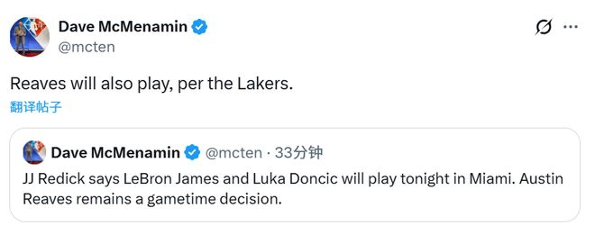 北京時間3月20日,湖人官方宣布,詹姆斯(左腳關節炎)、東契奇(右髖酸痛)都已經升級為可以出戰,將出戰今日對熱火的背靠背比賽。此前他倆和里夫斯都被列為出戰成疑的狀態,里夫斯(右臂挫傷)經過賽前評估后,也確定出戰熱火。