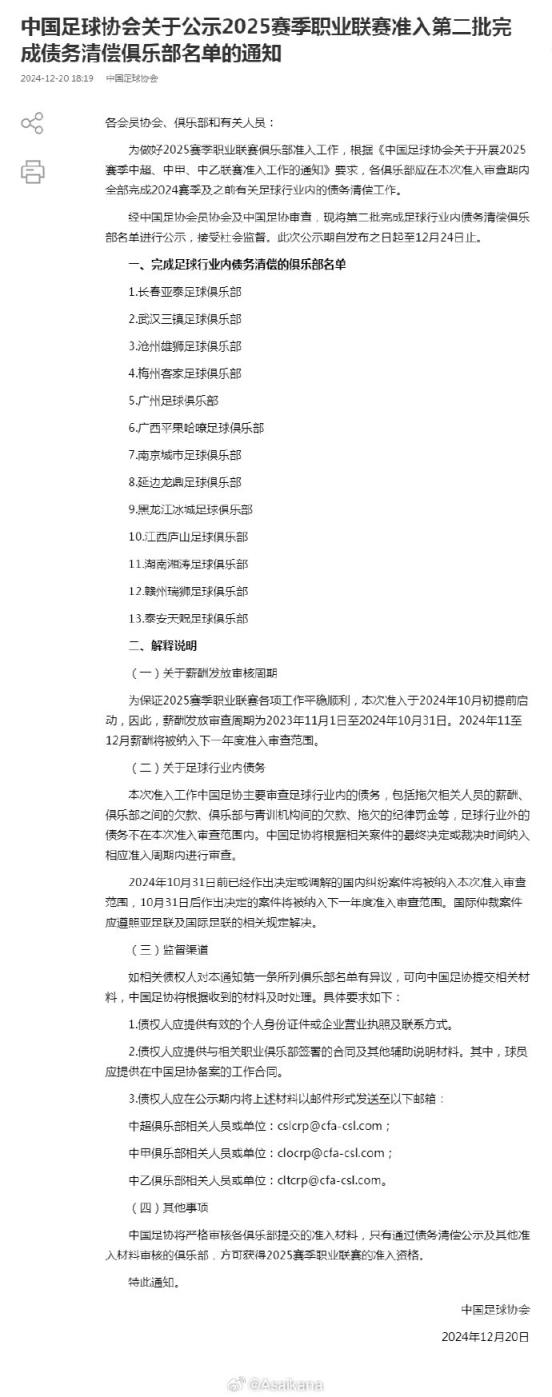 中國足協公示2025賽季職業聯賽準入第二批完成債務清償俱樂部名單,此前不在第一批名單里的長春亞泰、武漢三鎮、滄州雄獅、梅州客家、廣州、廣西平果哈嘹、南京城市、延邊龍鼎、黑龍江冰城、江西廬山、湖南湘濤、贛州瑞獅、泰安天貺全員上榜,相當于所有三級職業俱樂部都進行了完成債務清償的公示。 ???