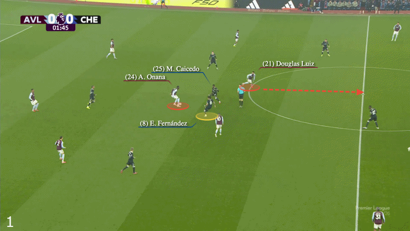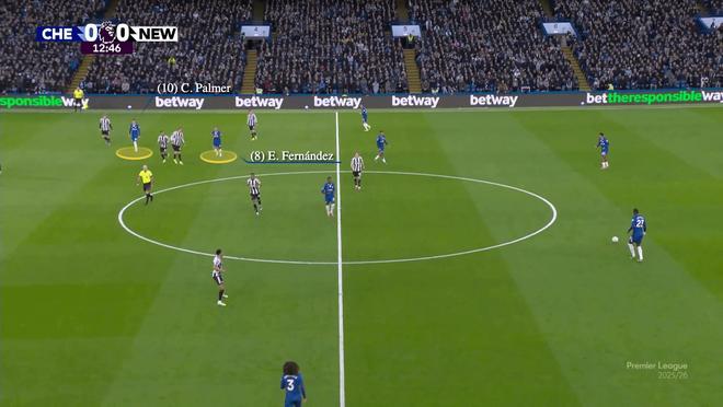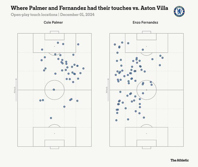 在那場對陣維拉的比賽中,他們各自影響力范圍有著自然的平衡,帕爾默主要在球場右側觸球,費爾南德斯在左側: