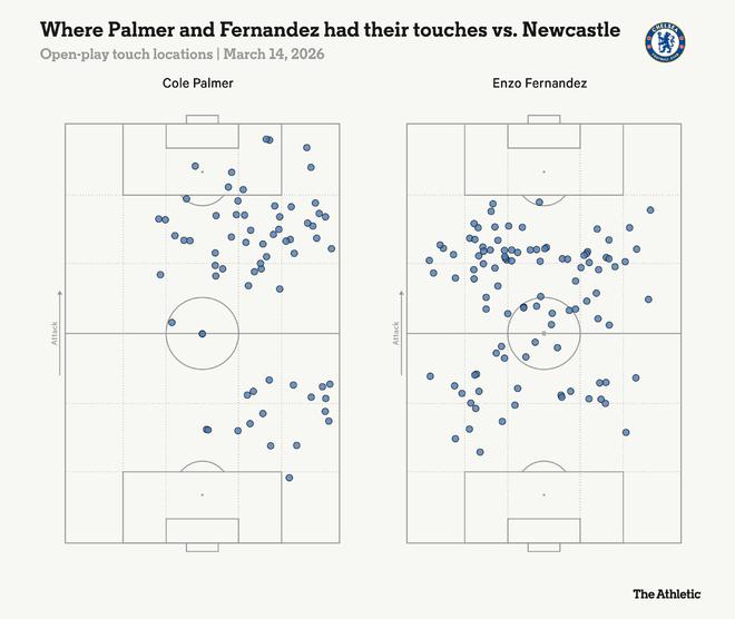 在2025-26賽季,他沒有英格蘭球員出場的21場比賽,與兩人共同出場的24場相比,他在對方禁區內觸球次數幾乎翻倍,傳入進攻三區的次數翻倍。他每90分鐘創造機會的平均值從1.6次增加到2.3次。他的射門次數也更多(預期進球值顯著更高),射正次數翻倍,并且進球轉化率更高。點球對此有貢獻,因為帕爾默缺席時費爾南德斯是主罰者。